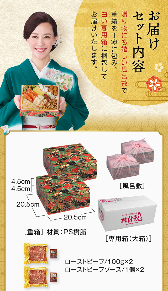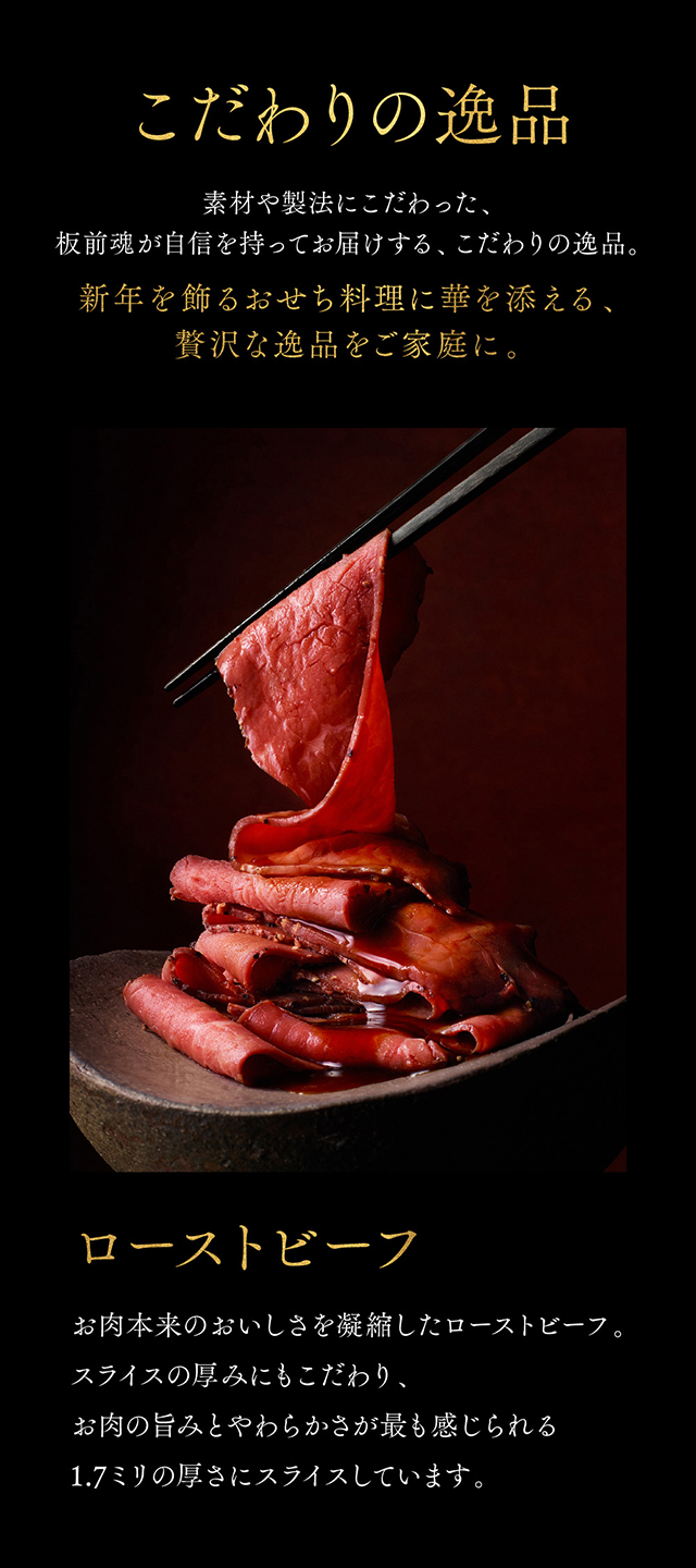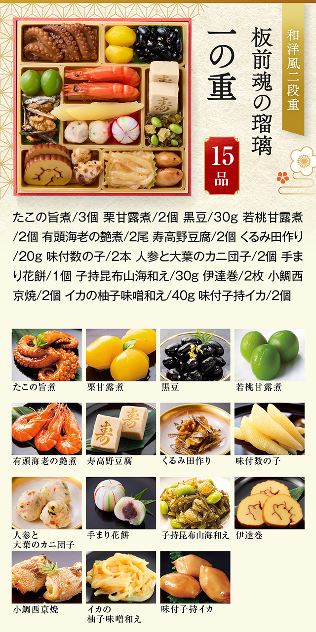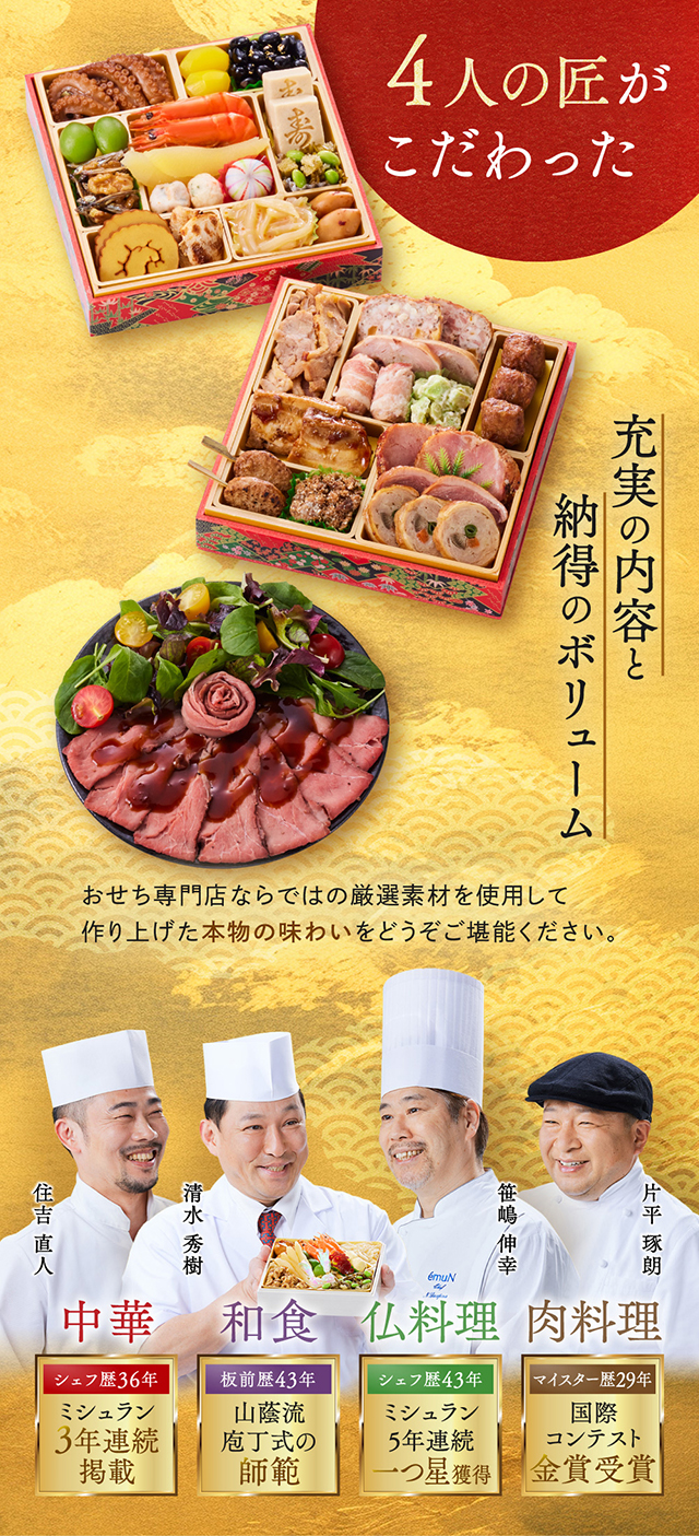 板前魂のおせち料理は、函館、小樽 、仙台、 築地 、山梨、金沢、浜松、 京都 、下関、 博多 、鹿児島など日本や海外の産地をまわり厳選した食材を使用し、有名店やホテルで修行したシェフや繁盛店を営む板長といった4人の匠が監修しています。