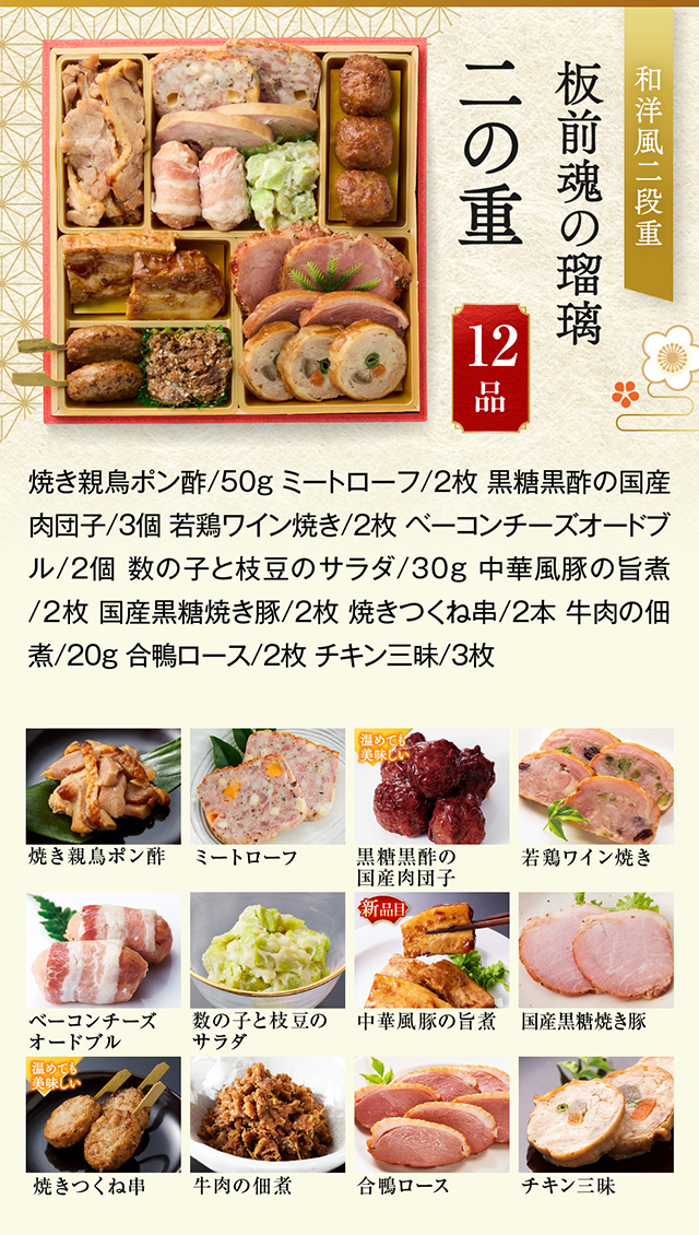 【二の重】焼き親鳥ポン酢/ミートローフ/黒糖黒酢の国産肉団子/若鶏ワイン焼き/ベーコンチーズオードブル/数の子と枝豆のサラダ/中華風豚の旨煮/国産黒糖焼き豚/焼きつくね串/牛肉の佃煮/合鴨ロース/チキン三昧