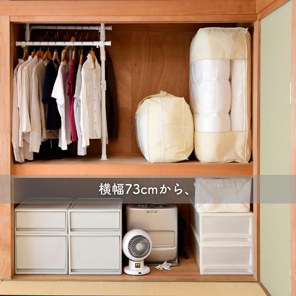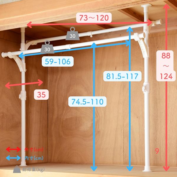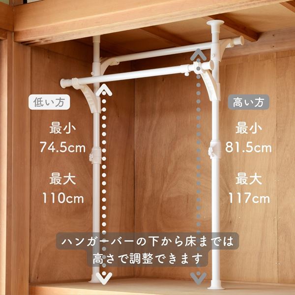 | 商品説明 | ●ネジ・クギ不要、賃貸でもできる、押入れをクローゼットにかんたんリメイク! ●ヨコ向き、タテ向き、どちらでも設置できるつっぱり固定式 ●前後で衣替えに便利な、ダブルタイプ ●互い違いに掛けられる2本のハンガーバー ●たてよこ伸縮式、押し入れ内の凸凹にも対応する高さ調整&幅は最大120cmでたっぷり収納 ●強度も安心、1本あたり耐荷重30kgで服もしっかり収納 ●ボタンを押して上げるだけ、オリジナル突っ張り機構で超カンタンに設置可能 ●ハンガーバー内寸:幅59-106cm ●下から上段ハンガーバーまでの高さ:81.5-117cm ●下から下段ハンガーバーまでの高さ:74.5-110cm ●ハンガーバー直径:28/25mm ●支柱直径:28/32mm ●耐荷重:1本30kg、合計60kg |