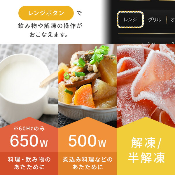 | 商品説明 | ●電源:AC100V(50/60Hz) ●庫内有効寸法:幅26.7×奥行28.6×高さ19.0cm ●電源コード長さ:1.5m ●電子レンジ ・高周波出力:650W(60Hzのみ)/500W/200W相当 ・発振周波数:2450MHz ●オーブン ・消費電力:1000W(50/60Hz) ・温度調節範囲:40℃(発酵)、100〜200℃ ●グリル ・消費電力:750W(50/60Hz) ●電子レンジ機能の年間消費電力量:62.8kWh/年 ●オーブン機能の年間消費電力量:10.5kWh/年 ●年間待機時消費電力量:0.0kWh/年 ●年間消費電力量:73.3kWh/年 ●オートオフ機能搭載 ●消音機能搭載 ●チャイルドロック搭載 ●フラットテーブルでお手入れ簡単 ●付属品:角皿 ●メーカー保証:1年間 ※2025年2月よりホワイト色を追加しております |