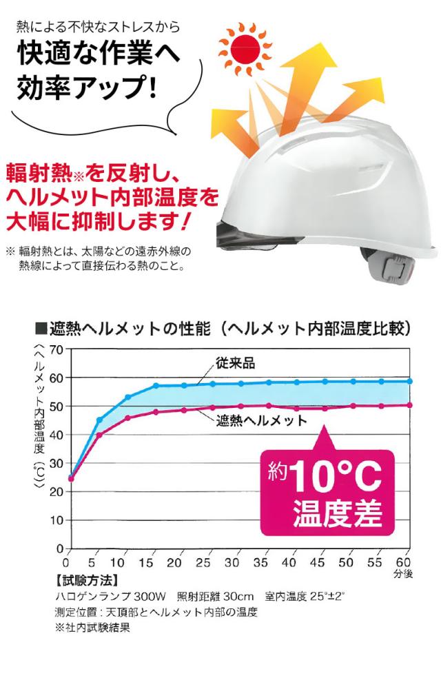 ●遮熱材を樹脂に練りこんだ素材を使用。練りこむことで、帽体の傷や塗装剥がれによる遮熱効果の低下がありません。