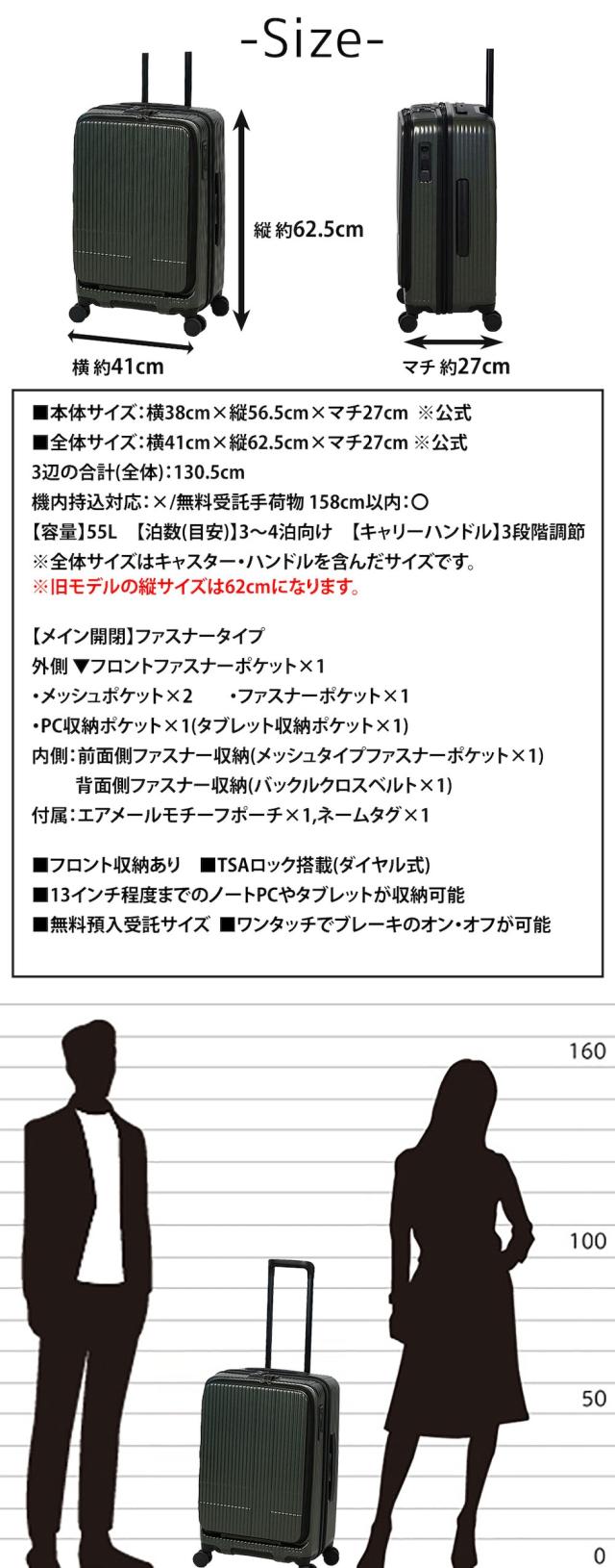 | サイズ(約) ※当店実寸値 | 公式サイズ 本体:横38cm×縦56.5cm×マチ27cm 全体:横41cm×縦62.5cm×マチ27cm 3辺の合計(全体):130.5cm 機内持込対応:× 無料受託手荷物 158cm以内:〇 【容量】55L 【泊数(目安)】公式|1〜3泊程度、自社|3〜4泊程度 【キャリーハンドル】3段階調節 ※全体サイズはキャスター・ハンドルを含んだサイズです。 ※旧モデルの縦サイズは62cmになります。 | ||