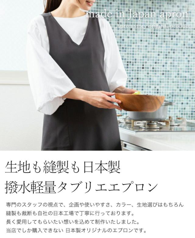 日本製 撥水軽量タブリエエプロン。軽量!驚きの約180gの撥水で水に強い生地を使用した、 ワンピースみたいにかわいいタブリエエプロン。 前と後ろがVネックとUネックになっていて、お好みで好きな着方ができる 2WAYエプロンです。 デザインやサイズ感にこだわった、丁寧な作りの日本製エプロン。 工場直営のエプロン専門店 エプロンストーリー ならではの高品質エプロンは、ギフトやプレゼントにも最適です。