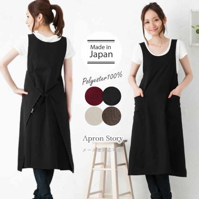 ポリエステル100%の生地でさらっとした肌触りとシワになにりくいエプロン。 ポリエステルは薄手で軽くて、乾きやすいので長時間使用される方や、 頻繁に使用する方にも人気です。 そのままお出かけができるおしゃれなワンピース風エプロン 着方は、後側にある紐を内側に結び、前側の紐を後ろで結んでください。 ※現在黒色の生地ロットの違いにより、 黒色のみ静電気が発生しやすく、ホコリが付きやすいです。