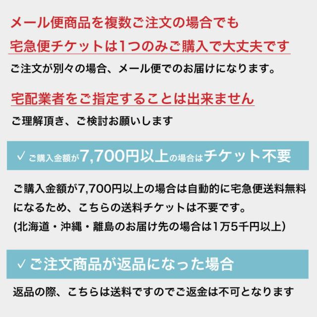 | ●こちらは宅急便配送に変更したい方の送料チケットです。 (北海道・沖縄・離島のお届け先は送料1,480円) 上記地域に宅配便でお届けしたい場合、当店にて ご請求金額を1,480円に修正させて頂きます。 ●ご購入商品と同じお買い物かごでご注文ください 。ご注文が別々の場合、メール便でのお届けになります。 ●メール便商品を複数ご注文の場合でも 宅急便チケットは1つのみご購入で大丈夫です。 ご注文が別々の場合、メール便でのお届けになります。ご注意ください。 ●宅配業者をご指定することは出来ません。 ●ご購入金額が7,700円以上の場合は自動的に宅急便送料無料になるため、こちらの送料チケットは不要です。 (北海道・沖縄・離島のお届け先の場合は1万5千円以上) ●ご注文商品を返品の際、こちらは送料ですのでご返金は不可となります。 |