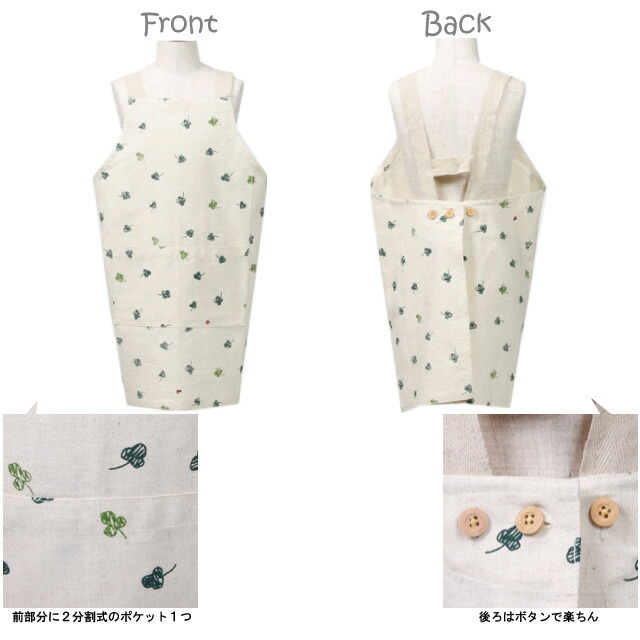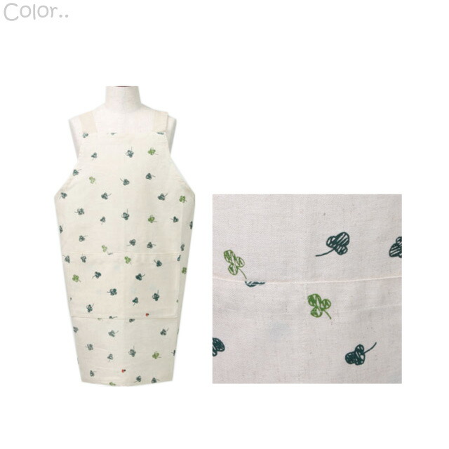 H型エプロンは動きやすくて、 後ろをボタンで留めて、かぶって着るだけなので、子供が一人で簡単に着れて 動きやすいと人気の型です。 かわいいクローバーの柄のエプロン。 ポケットは前部分2分割式が1つ付いています。 学校行事や幼稚園での給食エプロンはもちろんのこと、図画工作や、 家庭でのお手伝いにもぴったりなかわいいエプロンです。 エプロンはあまりサイズを選ばないので、プレゼントやギフトにもおすすめです! ※生地の性質上、織傷、節があります。