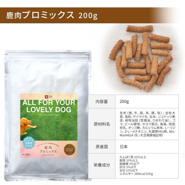 鹿肉、鶏肉、鶏レバー、鶏皮、さつまいも、押麦、大麦粉、にんじん、菜種油、乾燥卵白、オリゴ糖、卵殻カルシウム、ビール酵母、菜種レシチン、こんにゃく粉、ミネラル類(Mg、P、Zn、Se、Mn、Cu)、魚油、粉末昆布、エンザミン、ビタミン類(E、B2、D)