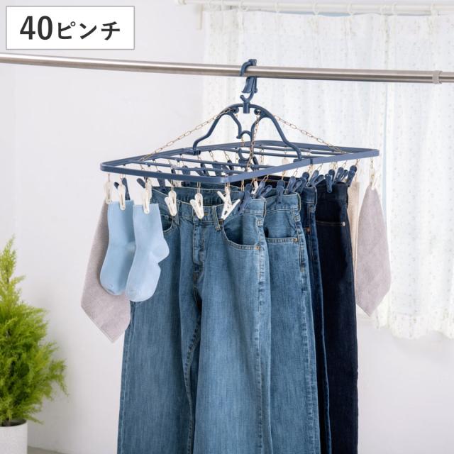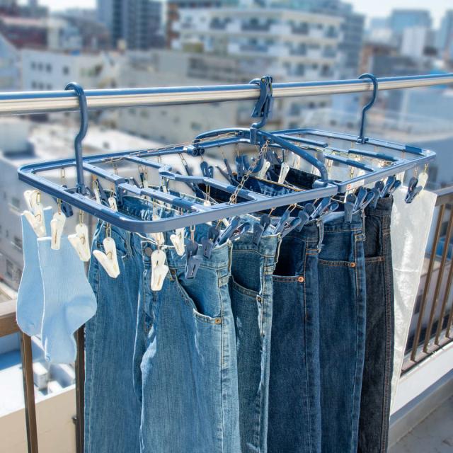 ジーンズもまとめて干せる、頑丈なストロングフレームと金属チェーンを採用した干し分け角ハンガーです。安定感があり、重たい衣類や厚手のジーンズも安心して干せます。毎日の洗濯でも揺れにくく、効率よく乾かせます。