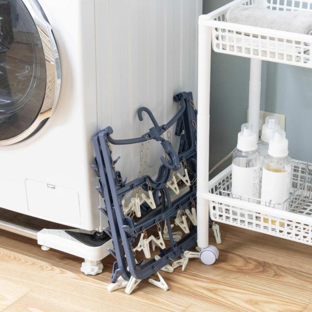 上折れ式でサッと広げられ、ピンチが絡みにくい設計です。使わないときは折りたたんで、洗濯機横やクローゼットの隙間にもスッキリ収納できます。