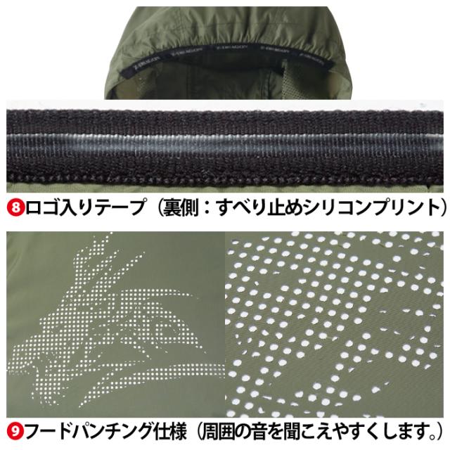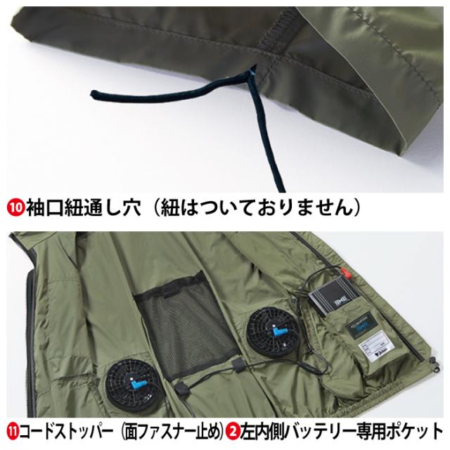 ◇機能:調整紐(首元)・左内側バッテリー専用ポケット・反射プリント(フード)・反射プリント(後右肩)・保冷剤用メッシュポケット・ロゴ入りスライダー・ロゴ入りテープ(裏側すべり止めシリコンプリント)・フードパンチング仕様(周囲の音を聞こえやすくします。)・袖口紐通し穴・コードストッパー(面ファスナー止め)・フード取り外し不可