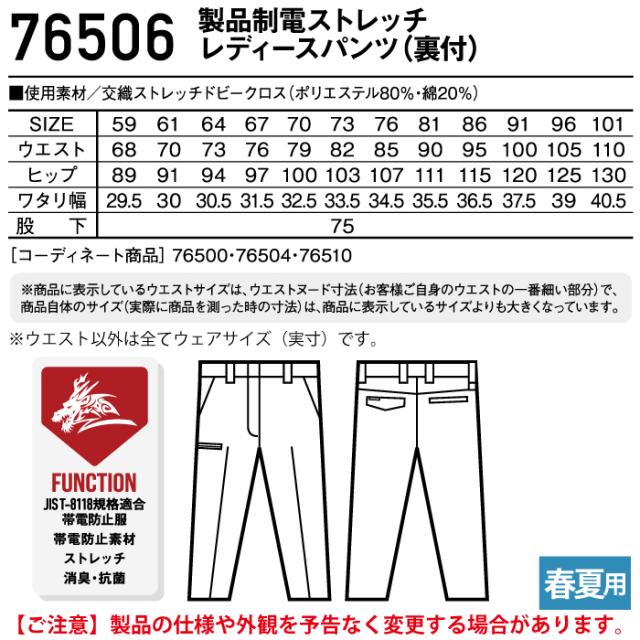 自重堂 Z-DRAGON 作業服 76506 製品制電ストレッチレディースパンツ(裏付) 59-76 春夏用 作業着