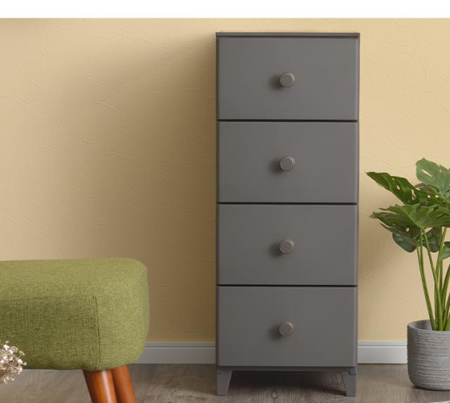 インテリアに馴染みやすいマットなカラーと、取っ手のゴールドの装飾が上品なリビングチェスト。