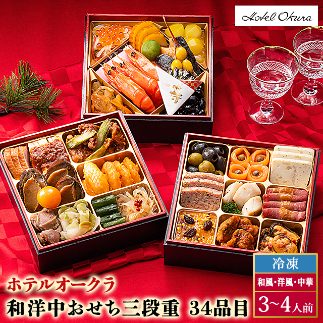 おせち 数量限定 ホテルオークラ 和洋中おせち三段重 34品目 3〜4人前 12月30日までにお届け / お節 料理 冷凍 2022 2023