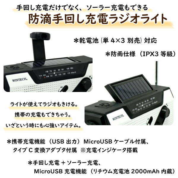 防滴手回し充電ラジオライト ソーラー充電付き KDR-201WP ホワイト 防雨仕様 緊急用サイレン搭載 アウトドアや災害時に便利 WINTECH/ウィンテック