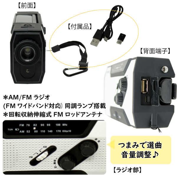 | 仕様 | *手回し充電+ソーラー充電、MicroUSB充電機能(リチウム充電池2000mAh内蔵) *乾電池(単4×3別売)対応 *AM/FMラジオ(FMワイドバンド対応)同調ランプ搭載 *明るさ調整機能付きLEDスポットライト(1灯)+読書用LEDライト(4灯※ソーラーパネル裏) *携帯充電機能(USB出力)MicroUSBケーブル付属、タイプC変換アダプタ付属 ※充電インジケータ搭載 *カラビナ付きハンドストラップ付属 *防雨仕様(IPX3等級) *緊急用サイレン搭載(音声、ライト点滅) *回転収納伸縮式FMロッドアンテナ |