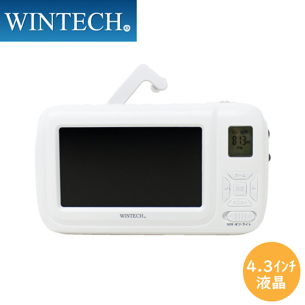 手回し充電対応ポータブルワンセグラジオ/ワンセグテレビ TVR-L38R ホワイト 録画機能搭載4.3インチ液晶 非常用LEDライト搭載SOS機能付き WINTECH/ウィンテック