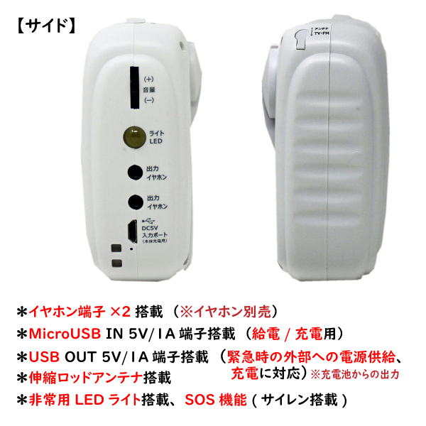 | 仕様 | *4.3インチカラー液晶(480×272)搭載なのでワンセグTV放送が気軽に楽しめる(ISDB−T) *ワンセグテレビ録画機能(MicroSD録画 ※カード別売り) *FMラジオ放送受信(76〜108MHz)FMワイドバンド対応 *AMラジオ放送受信(522〜1701Khz) *スピーカー音声出力:1W 8Ω *イヤホン端子×2搭載(イヤホン別売) *MicroUSB IN 5V/1A端子搭載(給電/充電用) *USB OUT 5V/1A端子搭載(緊急時の外部への電源供給、充電に対応)※充電池からの出力 *消費電力:約1W *伸縮ロッドアンテナ搭載 *非常用LEDライト搭載、SOS機能(サイレン搭載) |