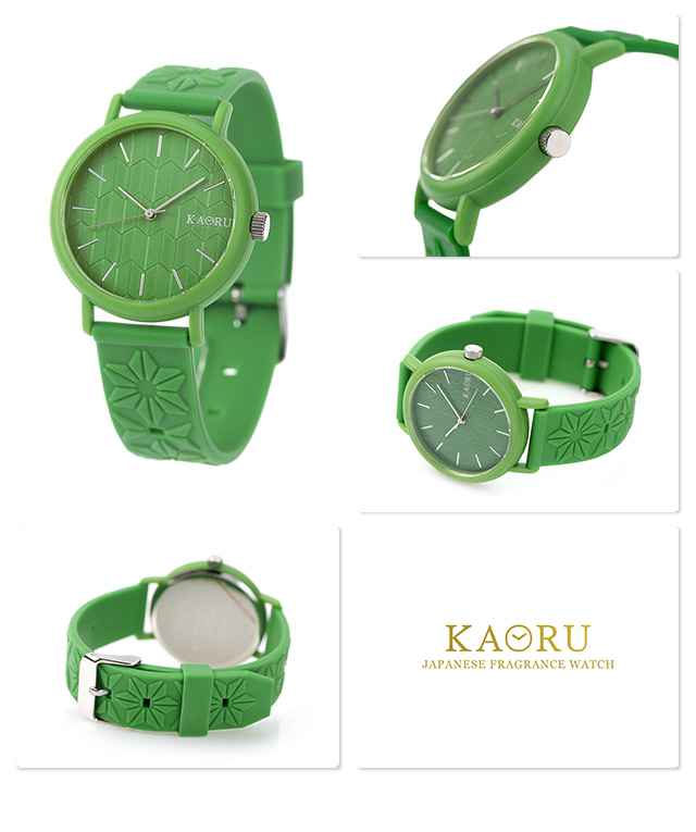 正規品 カオル 抹茶の香り 38mm メンズ レディース クオーツ ユニセックス 腕時計 KAORU001M2 KAORU MACCHA アナログ グリーン ◆KAORU(カオル)は、日本の老舗香料メーカー、ゴムメーカー、時計メーカーがタッグを組んで作り上げた時計です。日本の風景が思い出される、そんな香りと腕時計との出会い。気品があり、どこか懐かしい、ほのかな「香り」をオリジナルで調合し、時計ベルトにとじ込めました。優しく、ふんわり「和の香り」が漂います。しなやかで肌にフィットする質感は、まさに日本人の繊細さが表れています。 若葉の柔らかさと古木の落ち着きが特徴の抹茶モデル。抹茶は、10世紀または平安時代に日本で最初に登場した特別な種類の日本茶です。さわやかな苦味で国際的に人気のある味わいになりました。お菓子が入っているかのような可愛らしいボックスにいれてお届けします。