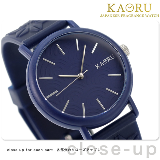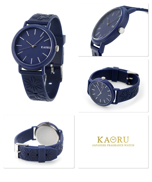 正規品 カオル 沈香の香り 38mm メンズ レディース クオーツ ユニセックス 腕時計 KAORU001J KAORU JINKO アナログ ネイビー ◆KAORU(カオル)は、日本の老舗香料メーカー、ゴムメーカー、時計メーカーがタッグを組んで作り上げた時計です。日本の風景が思い出される、そんな香りと腕時計との出会い。気品があり、どこか懐かしい、ほのかな「香り」をオリジナルで調合し、時計ベルトにとじ込めました。優しく、ふんわり「和の香り」が漂います。しなやかで肌にフィットする質感は、まさに日本人の繊細さが表れています。 癒しを与えてくれる沈香の香り。文字盤デザインは青海波模様をあしらっています。無限に広がる波の文様は、未来永劫へと続く幸せへの願いと、人々の平安な暮らしへの願いが込められており、縁起の良い柄とされています。お菓子が入っているかのような可愛らしいボックスにいれてお届けします。