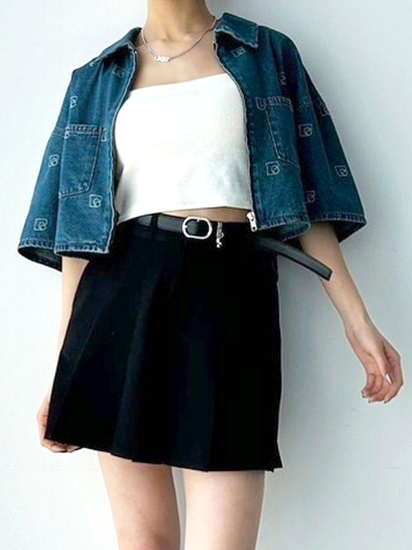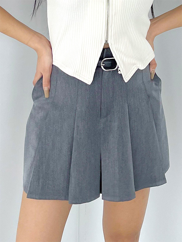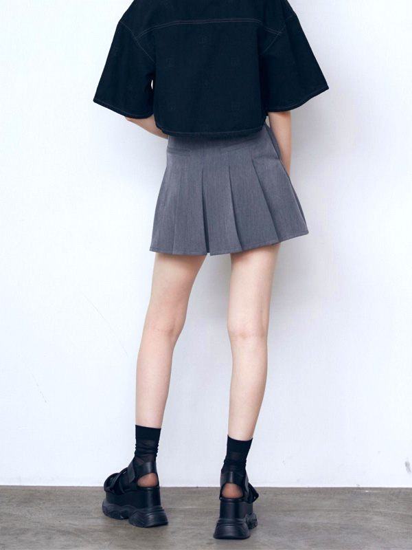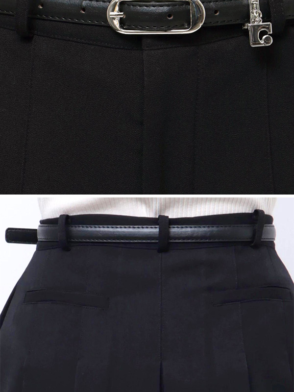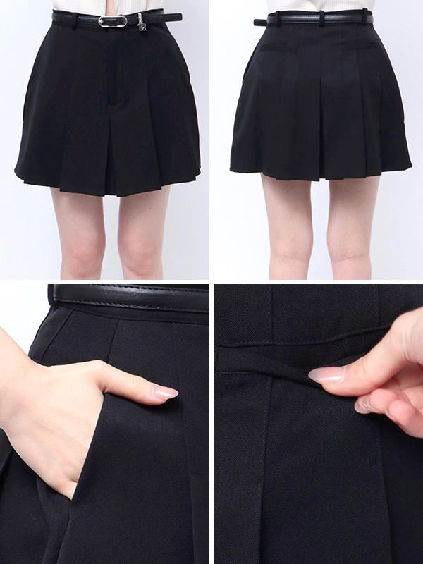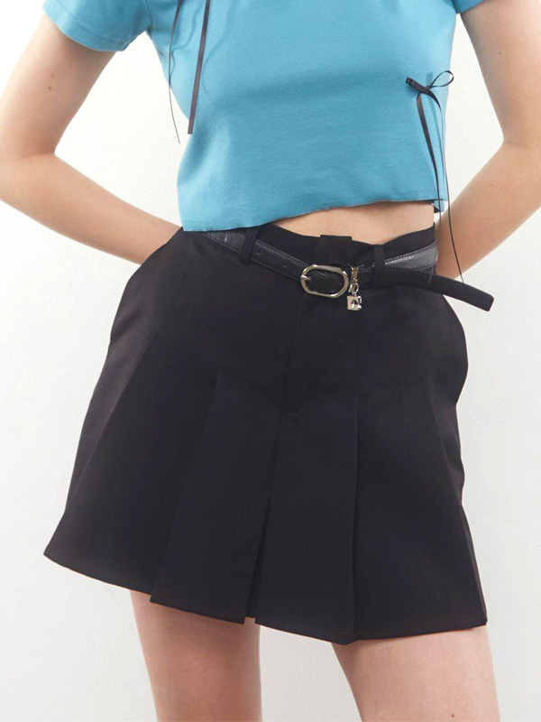 ベーシックに使いやすいプリーツスカートと、オリジナルのボックスEマークをポイントチャームにしたベルトがセットになった1枚。