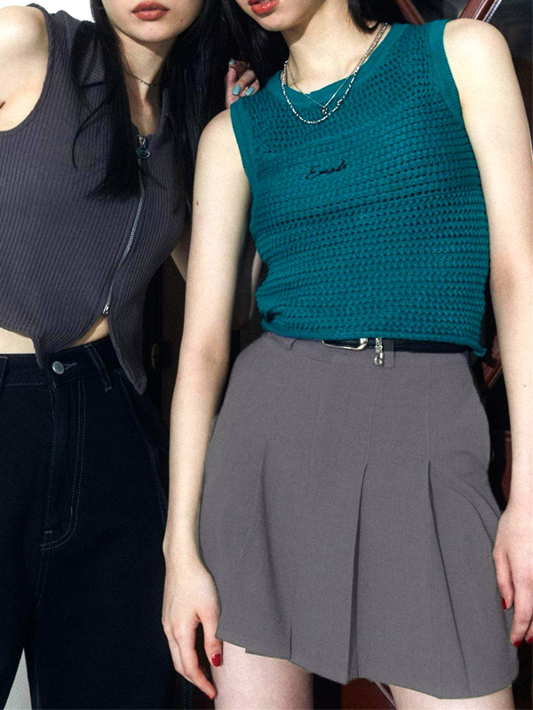 ショート丈のトップス合わせや、逆開ファスナーのスリットジップタンクトップでウエストのベルト部分をチラ見せしたコーディネートがおすすめです。
