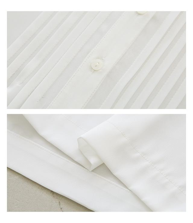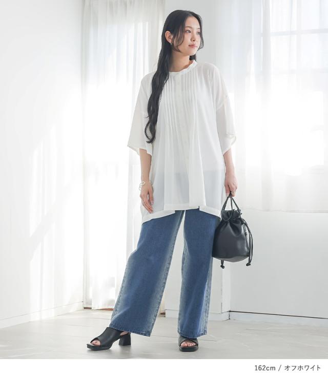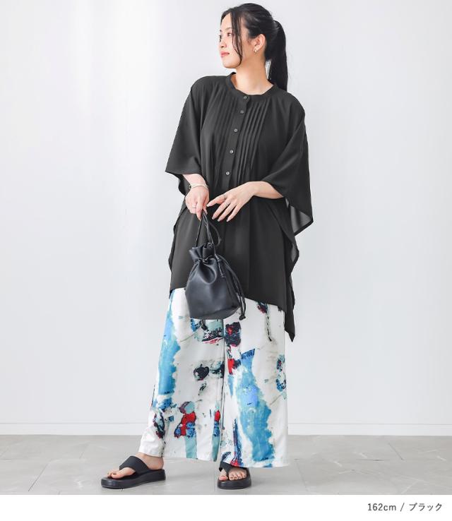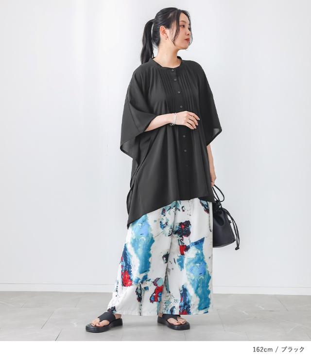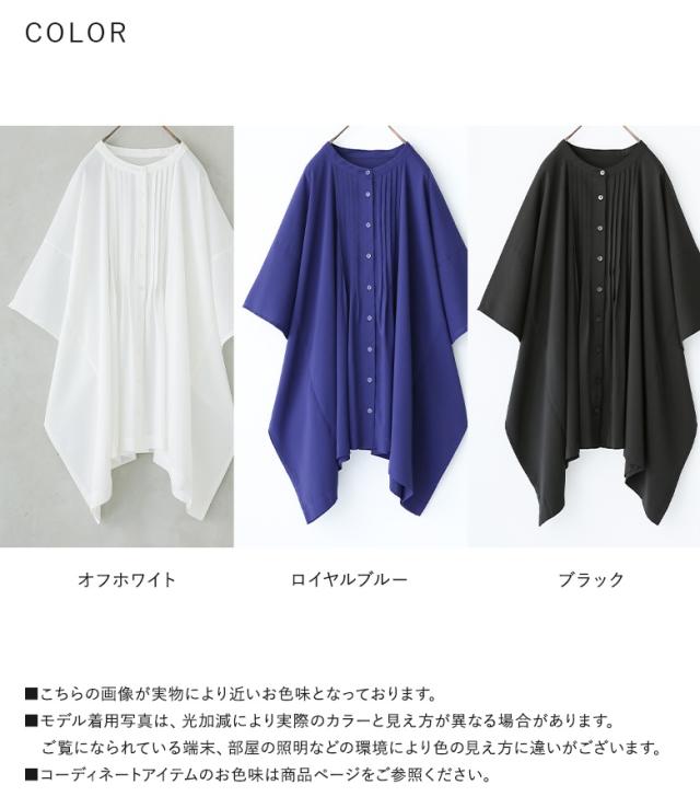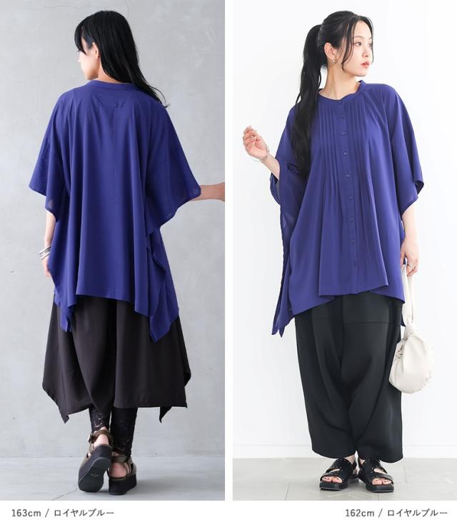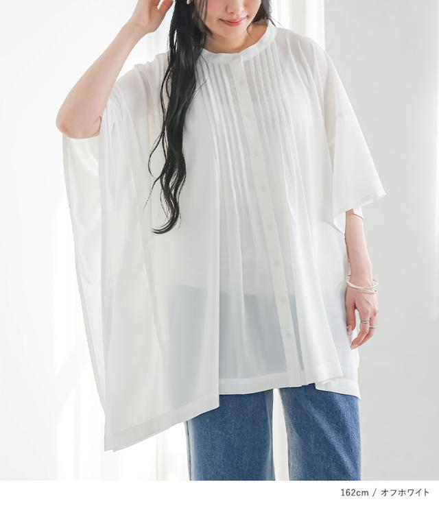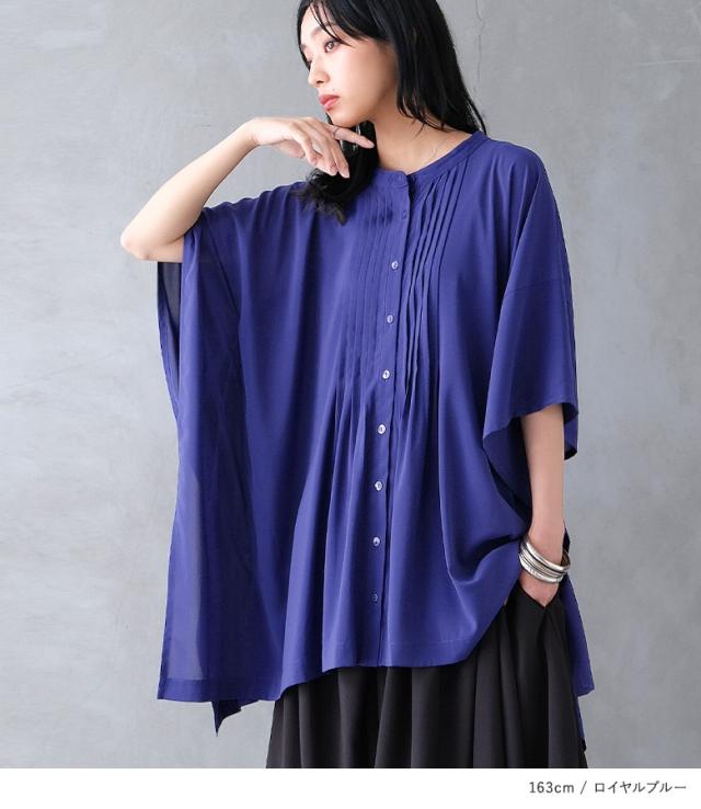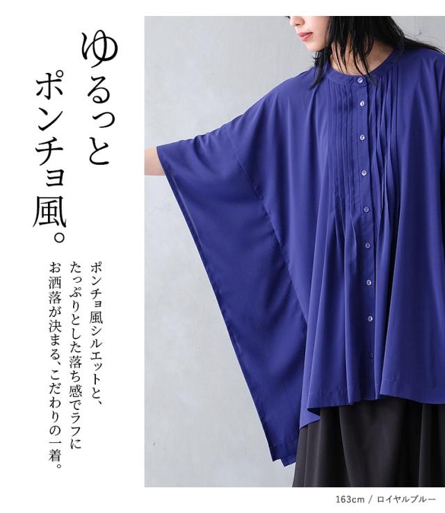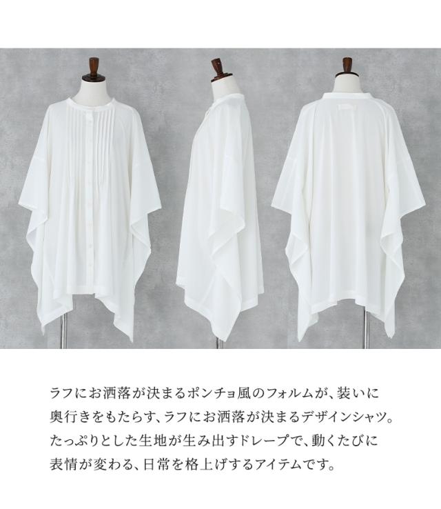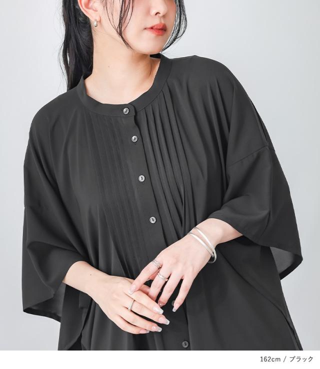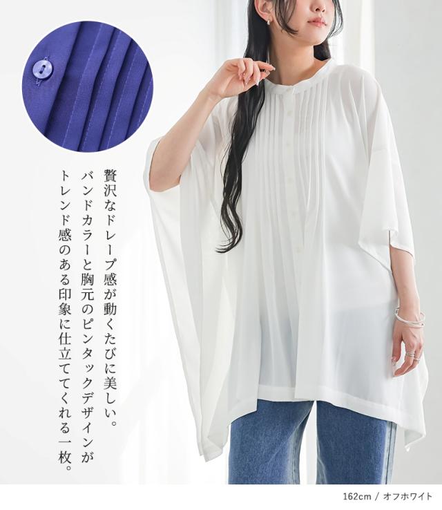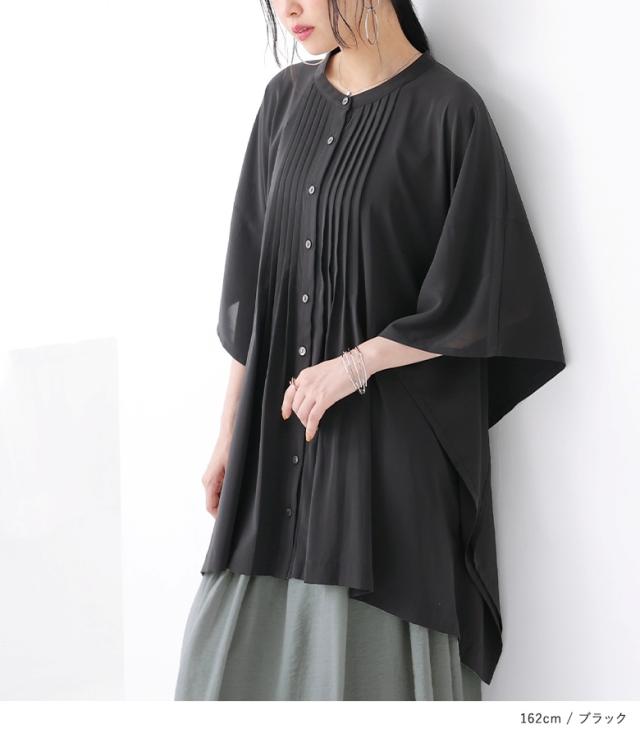 『ポンチョ風ピンタックシャツ』 ※メール便可※【10】[シャツ ブラウス レディース 春 夏 トップス 半袖 五分袖 ロングシャツ バンドカラー ピンタック ドレープ ポンチョ風 落ち感 薄手 ゆったり 体型カバー オシャレウォーカー]