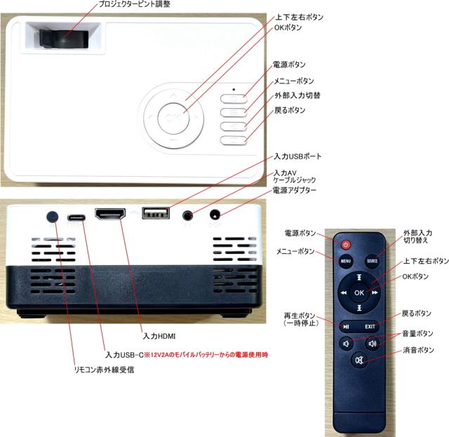 【簡単操作】プロジェクター本体のボタンでの操作、リモコンでの操作。操作方法は当店オリジナル日本語説明書付き。