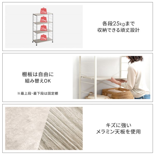 1段耐荷重25kg 頑丈設計 スチール ラック スチールシェルフ アイアン シェルフ フリーラック 収納棚 間仕切り リビング キッチン 子供部屋 本棚 キャスター 白 ホワイト グレー
