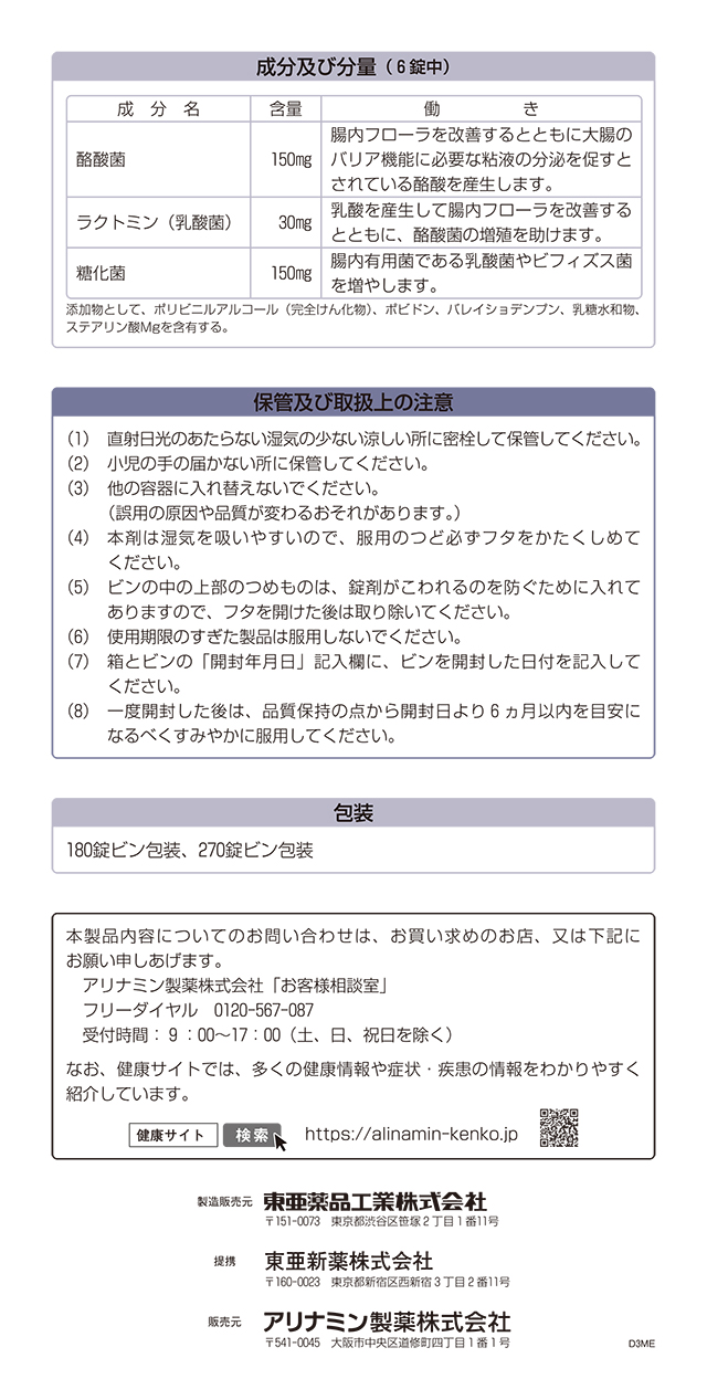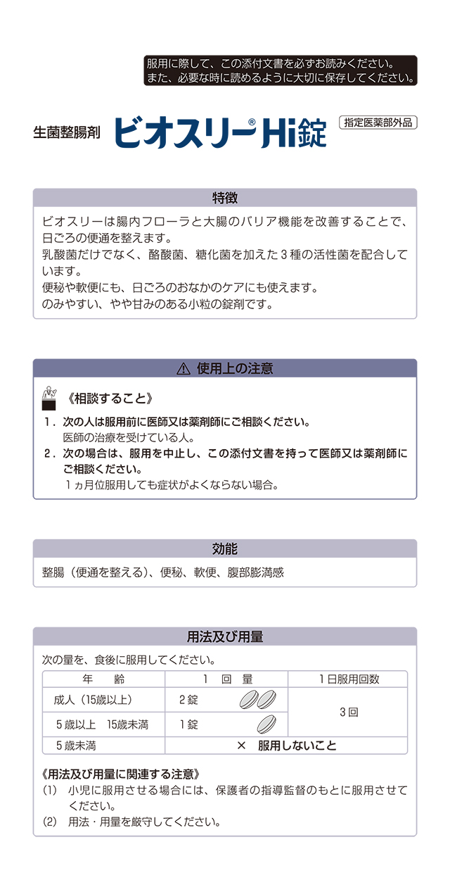 商品名 ビオスリーHI錠 270錠 【指定医薬部外品】 アリナミン製薬 メーカー アリナミン製薬 容量 270錠 使用期限 商品の発送時点で、240日以上あるものをお届けいたします 販売名 ビオスリーHi錠 区分 指定医薬部外品 効果・効能 整腸(便通を整える)、便秘、軟便、腹部膨満感 用法・容量 次の量を食後に服用してください。