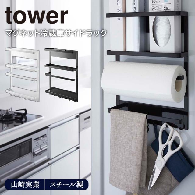 マグネット冷蔵庫サイドラック tower 山崎実業 キッチン収納 小物入れ フック マグネット ラック 棚 冷蔵庫横 キッチンペーパーホルダー ラップホルダー モノトーン 白 黒 おしゃれ 収納 キッチン雑貨 YAMAZAKI タワーシリーズ