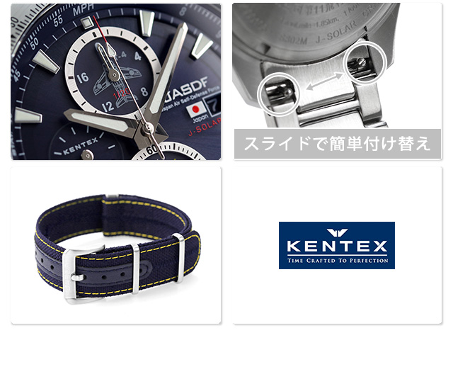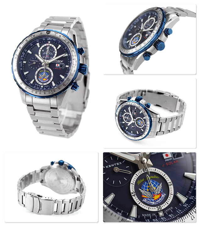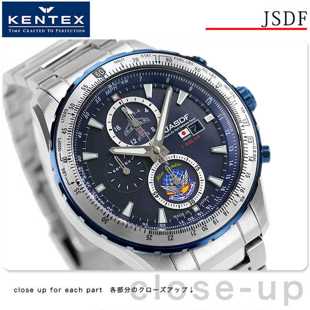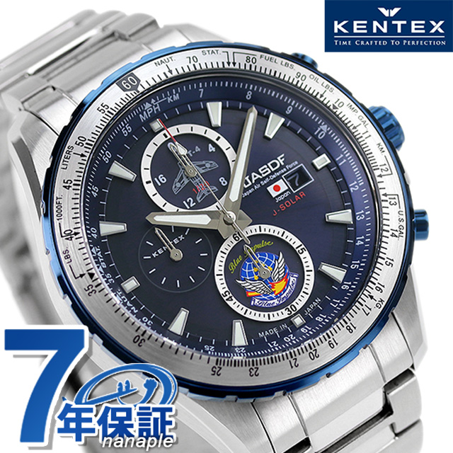7年保証キャンペーン 正規品 ケンテックス ブルーインパルス ソーラープロ 43mm クロノグラフ 日本製 ソーラー メンズ 腕時計 S802M-03 Kentex Blue Impulse Solar Pro アナログ ダークブルー シルバー ◆Kentex(ケンテックス)から、ブルーインパルスの設立年にちなんだ1960本限定モデルが登場。クロノグラフとフライトコンピュータ(回転計算尺)を備えた本格パイロット仕様。盤面6時位置には、航空自衛隊幕僚監部協力によるブルーインパルス公式エンブレムがデザインされ、防衛相共済組合登録商品にふさわしい誇り高きデザインとなっている。更に、ブルーインパルスモデルだけのスペシャルアクセサリーとして、CORDURAナイロン製のNATOベルトが付属し、専用ツール不要のワンタッチ構造で簡単にベルト交換が楽しめる。裏蓋にはT-4の機体デザインと限定シリアルナンバーを刻印。T4機体とパイロットがデザインされたスペシャルギャランティーカード、専用プラスチックボックスと共にお届けします。