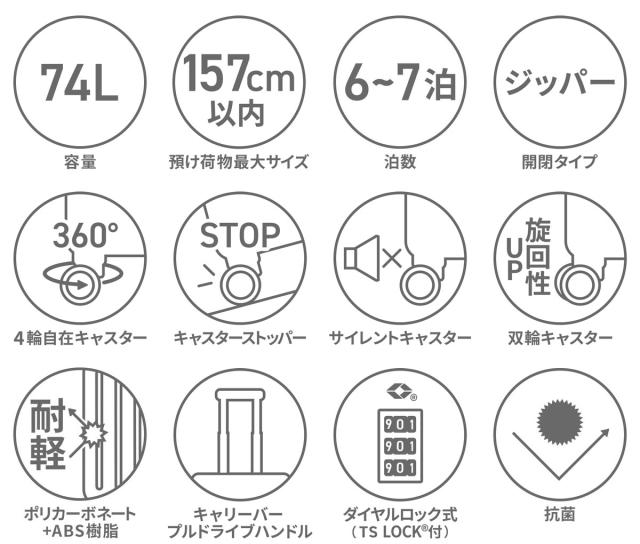 ace./エース/ACE/ace/ace.TOKYO/エーストーキョー/パリセイド3-Z/Palisades3-Z/パリセイド/スーツケース/キャリーケース/キャリーバッグ/ファスナー/ジッパー/ハードケース/ハード/74L/74リットル/大容量/大型/大きめ/TSAロック/TSA/TSロック/4輪/双輪/ダブルキャスター/静音/静音キャスター/抗菌/5泊〜1週間/5泊/6泊/7泊/5〜7泊/1週間/一週間/長期/旅行/トラベル/出張/正規品/10年保証/保証/ブランド/メンズ/レディース/軽量/軽い/Lサイズ/L/キャスターストッパー/ストッパー/かわいい/可愛い/おしゃれ/海外