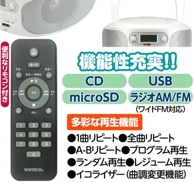 送料無料 リモコン付き 多機能CDラジオ パールホワイト 家電 AV CD AM FM ラジオ ヘッドホン端子 外部入力 USB再生 microSD再生 2スピーカー 持ち運びアーム付き 2WAY電源 AC100V電源 乾電池OK 庭仕事 畑仕事 現場 アウトドア コンパクト おすすめ