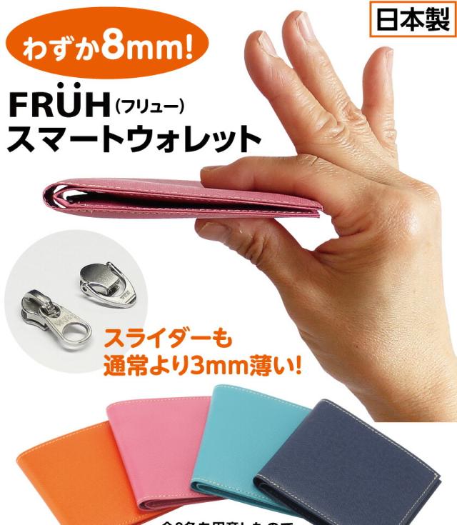 送料無料 日本製 FRUH フリュー スマートウォレット 札入 小銭入 カード入 手作り ブラック ブラウン グリーン ネイビー オレンジ ピンク サックス ワイン 牛革 革 二つ折り財布 薄型 薄い 財布 ウォレット コンパクト ふたつ折り 父の日ギフト 贈り物 プレゼント おすすめ