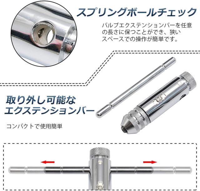 【仕様方法】ラチェット機構を搭載したT型タップホルダー、回転方向の切替が可能で、上部ハンドルは、スライドさせての使用ができる。