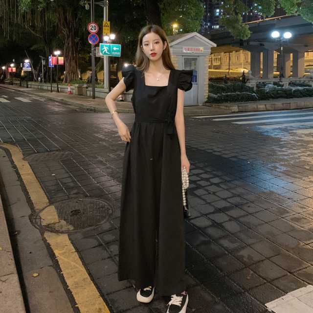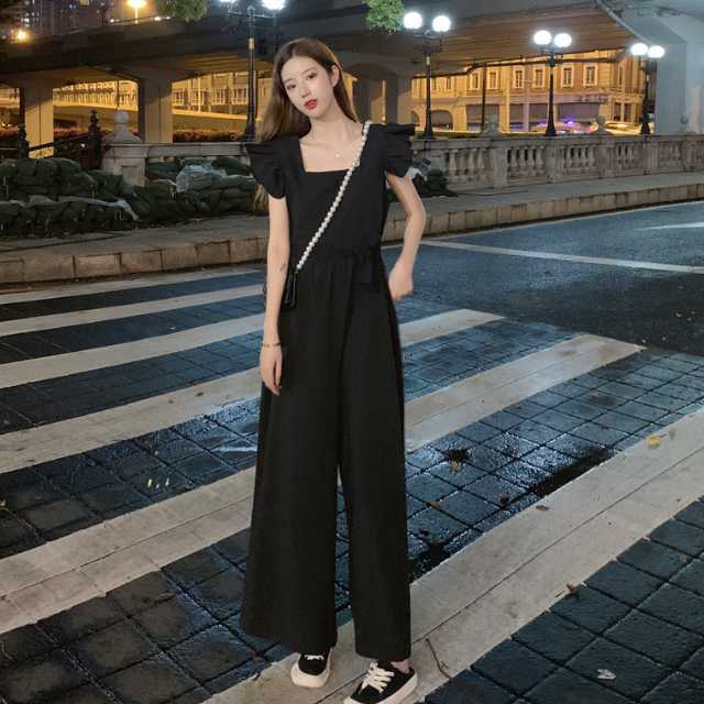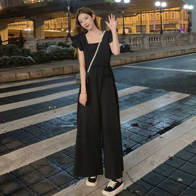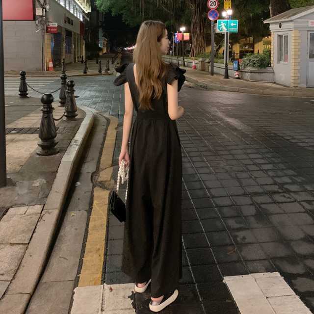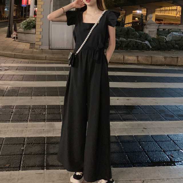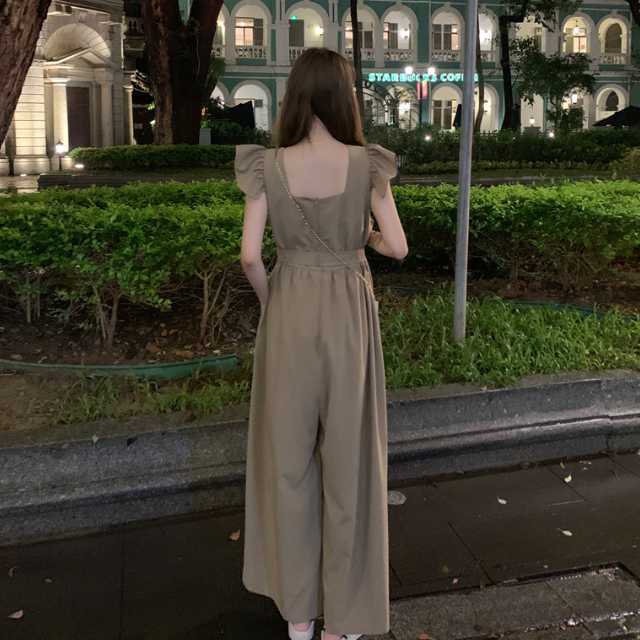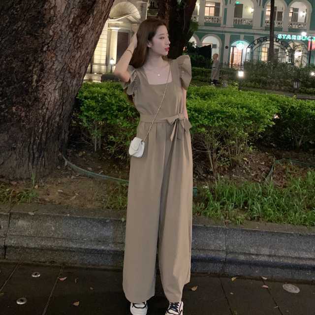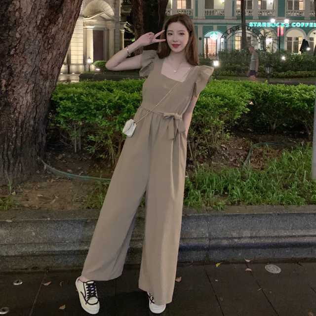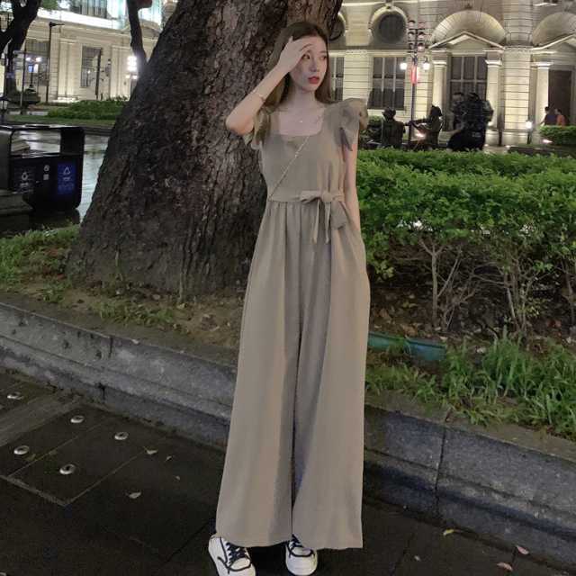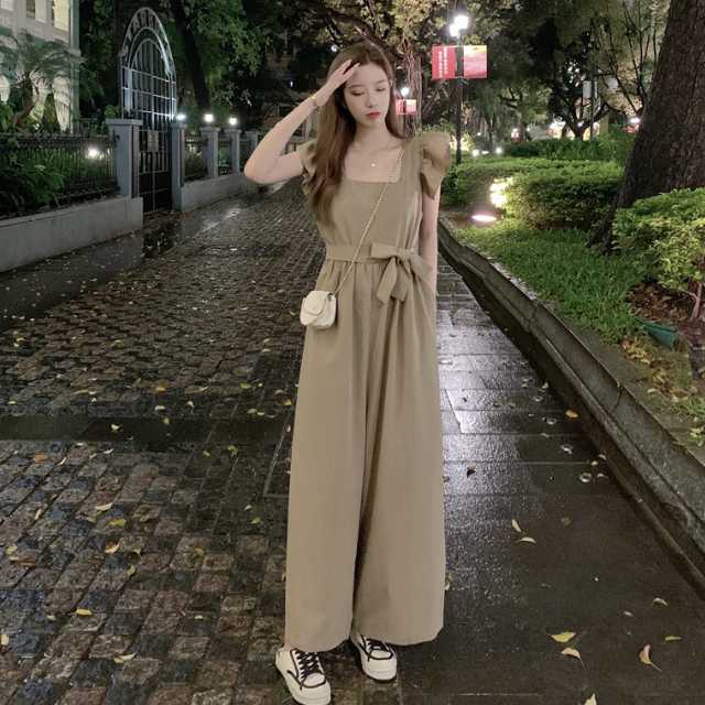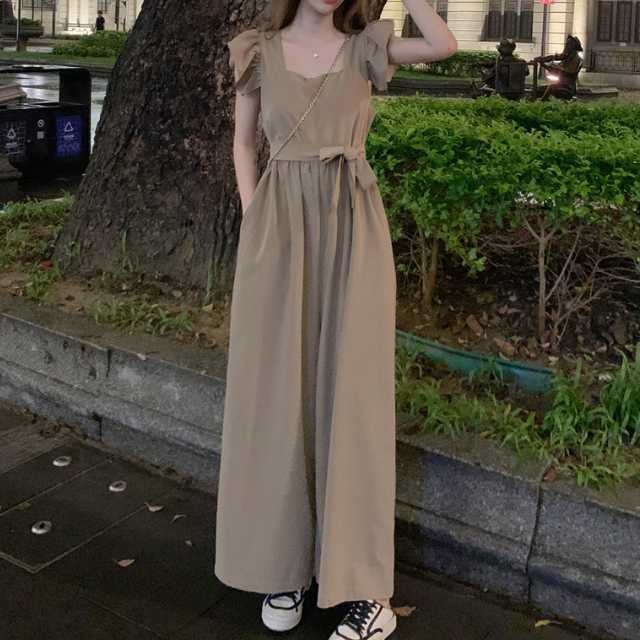 ワンピース サロペット パンツワンピース ロングワンピース フレアワンピース ウエストリボン ワイドパンツ ロング リボン フリル フレア ウエストマーク 大きいサイズ スクエアネック キレセク