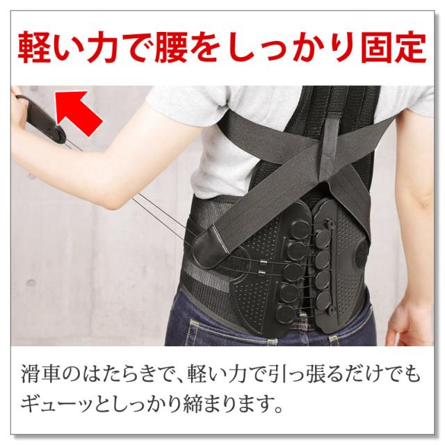 腰部分には9個の滑車がついており、滑車の力で腰をしっかり締め上げて固定できます。