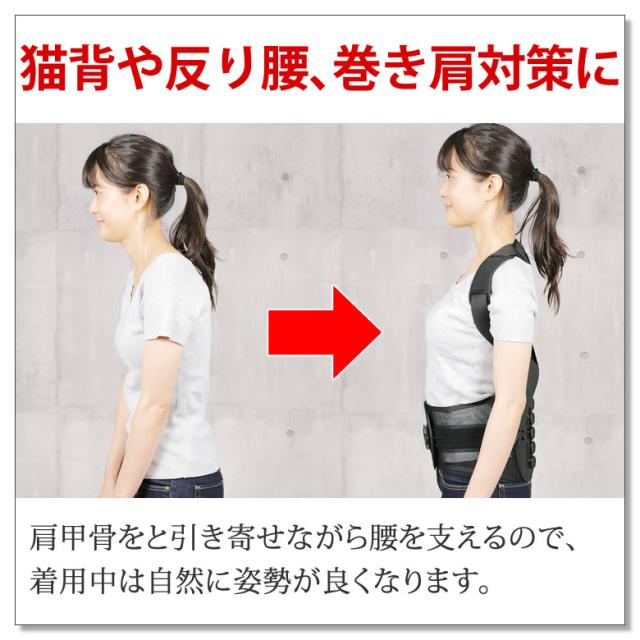 肩甲骨をと引き寄せながら腰を支えるので、着用中は自然に姿勢が良くなります。