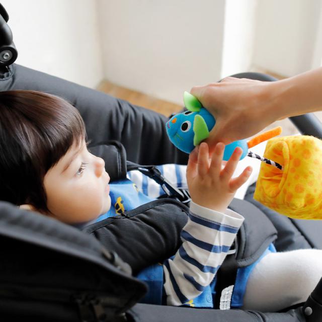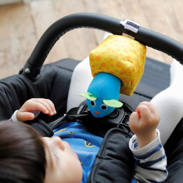 キャラクターを下に引っ張るとぶるぶると震えて、赤ちゃんの好きな音や触感などを たくさんのしかけで楽しめます。 ベビーカーやバッグに取り付けて。