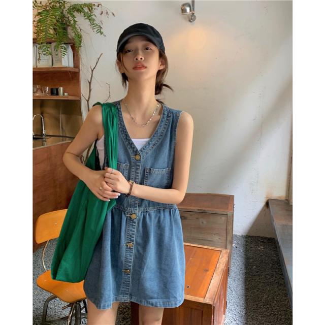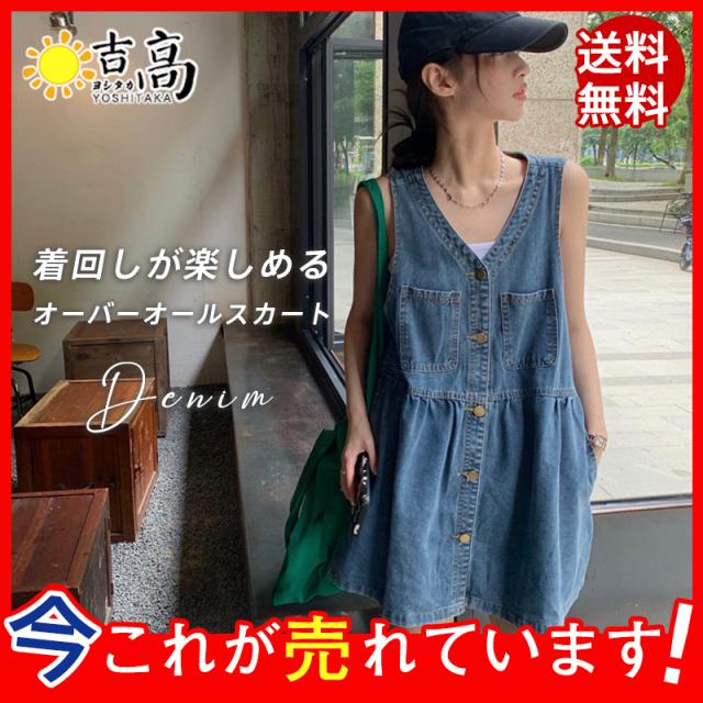 サロペット デニム レディース ワンピース ノースリーブ Vネック 大きいサイズ ポケット付き フロントボタン 着痩せ カジュアル ゆったり 普段着