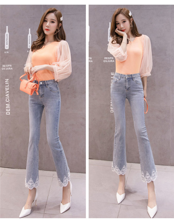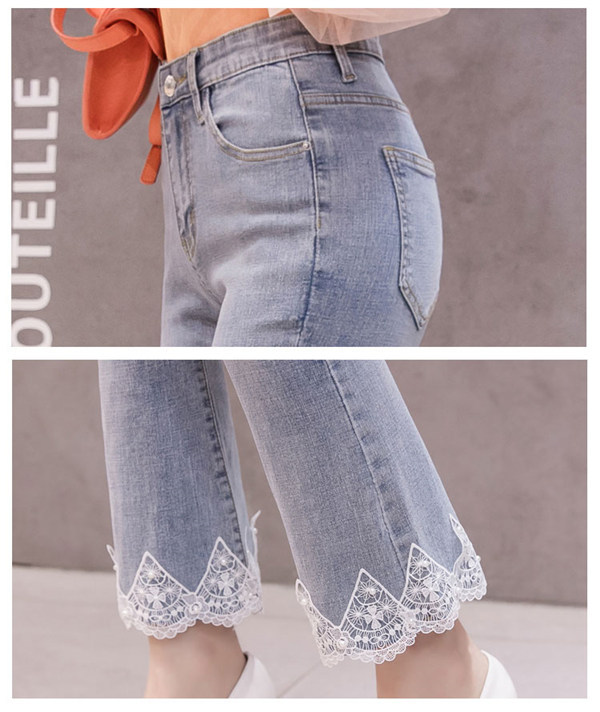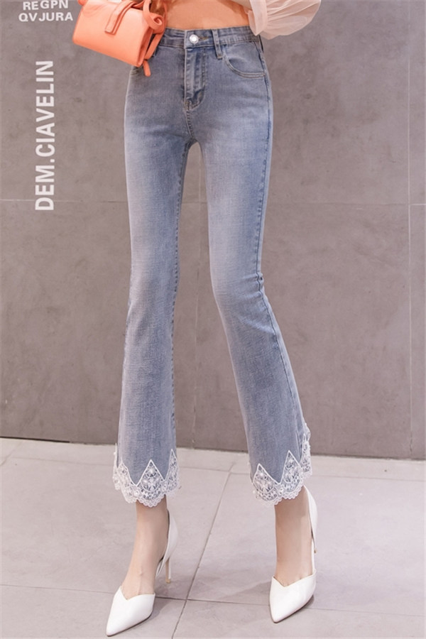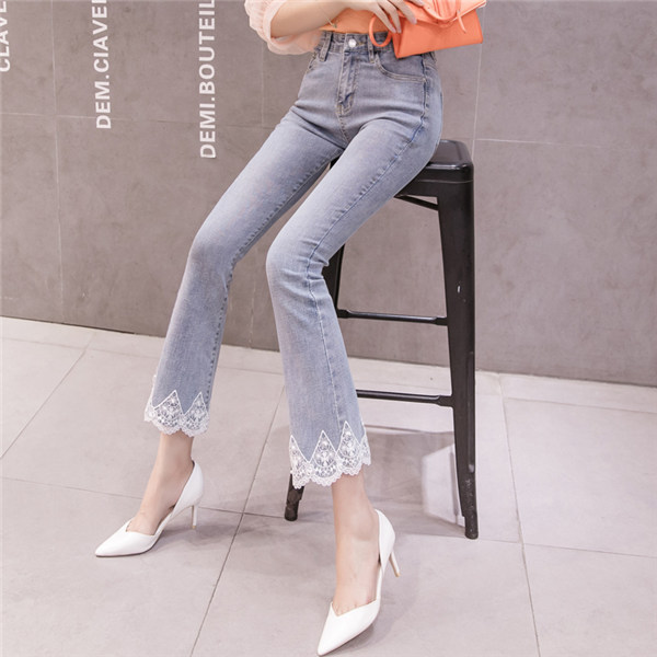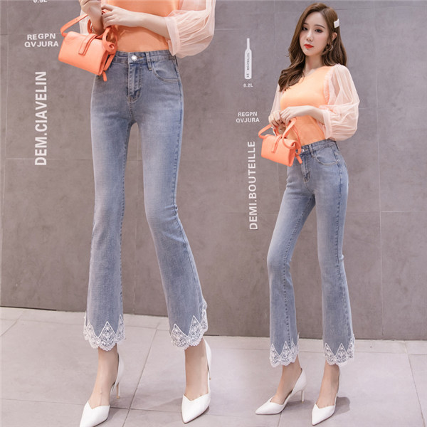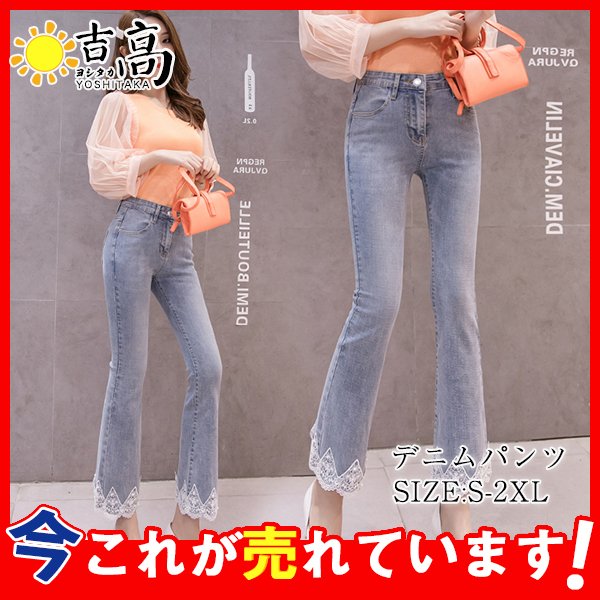 フレア デニム レディース レース Aライン ブーツカット 裾フリンジ スキニーデニム 九分丈 ストレッチ ハイウェスト ロング丈 ロングパンツ 美脚