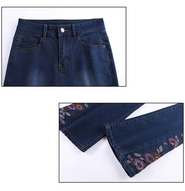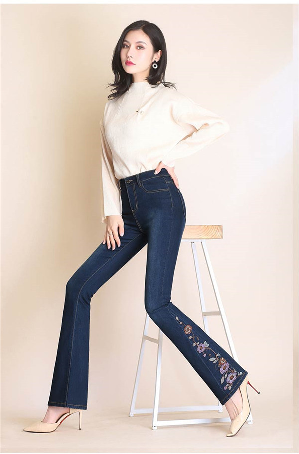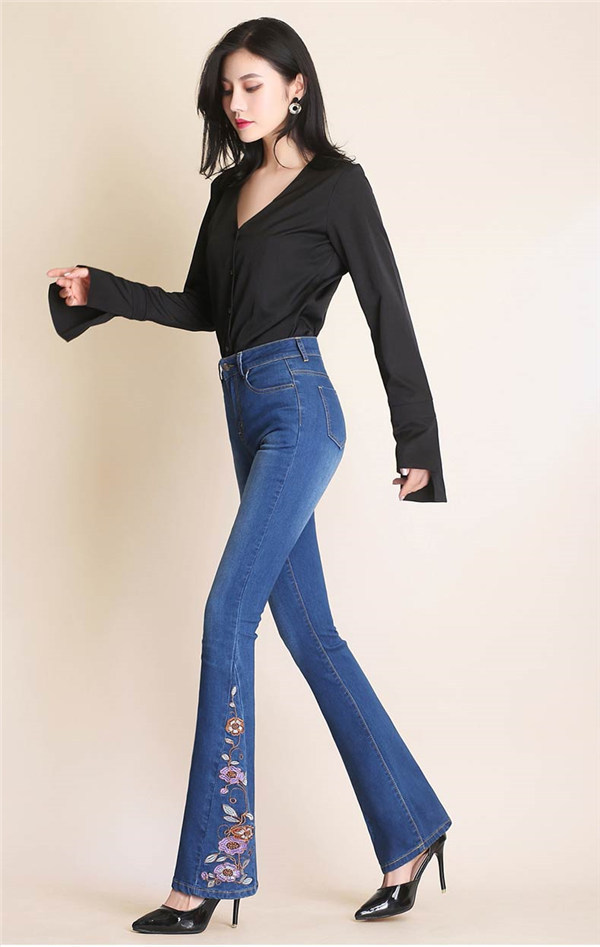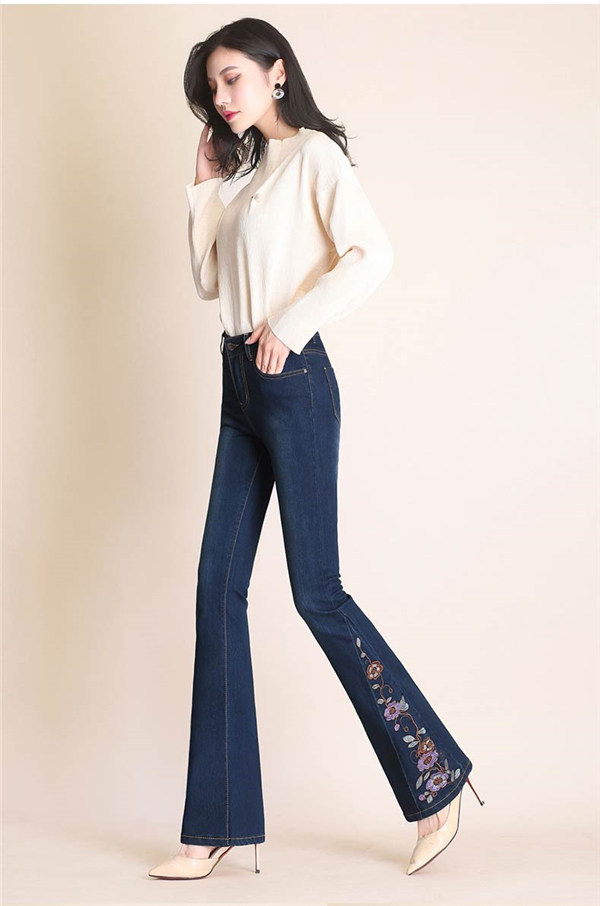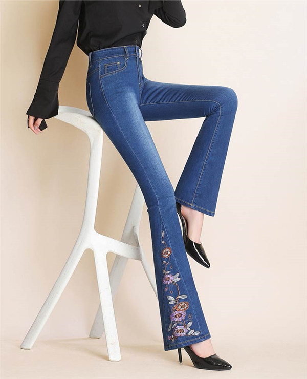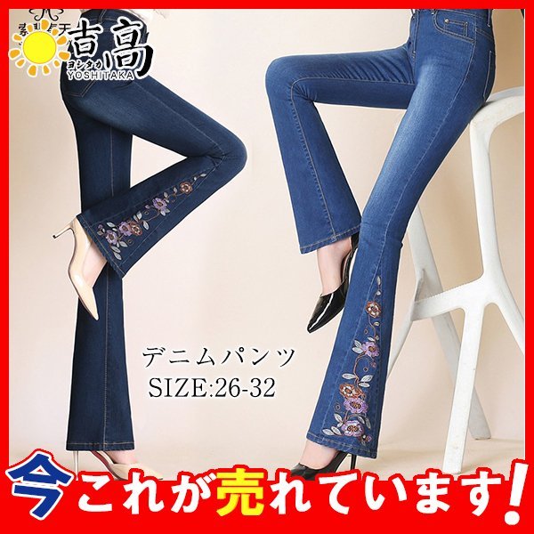 デニムブーツカット ブーツカット 刺繍 花柄 フレア ロング丈 レディース デニム ジーンズ ハイウェスト ストレッチパンツ デニムパンツ カジュアル