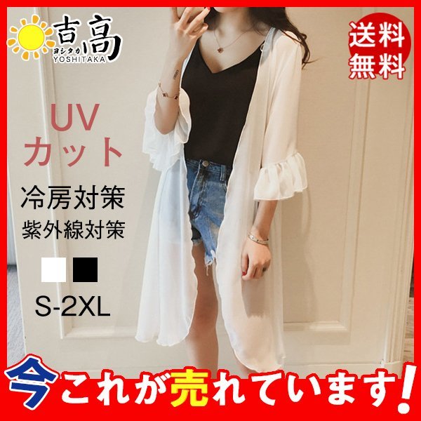 超人気 ロングカーディガン シフォン シースルー カーデ 五分袖 フリル袖 薄手 ロング丈 カーディガン 羽織り レディース リゾート ブラック ホワイト