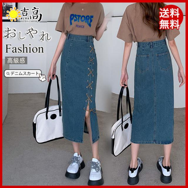 新作 スカート レディース デニムスカート スリット フレアスカート 紐付き Aライン ハイウエスト ゆったり ジーンズ 着痩せ シンプル 無地 通勤