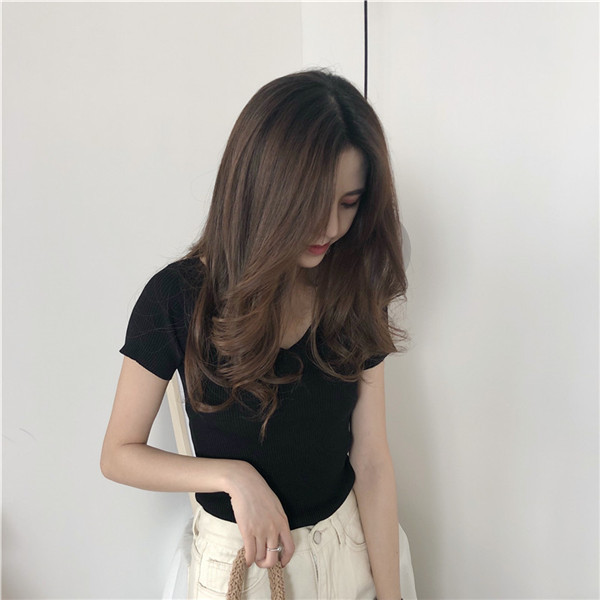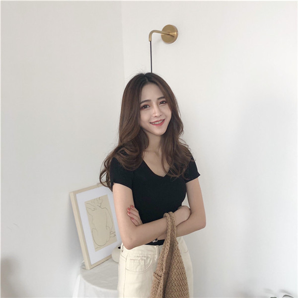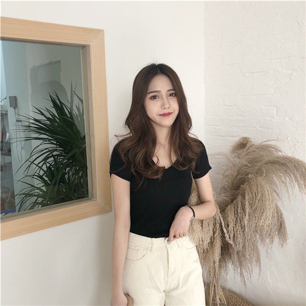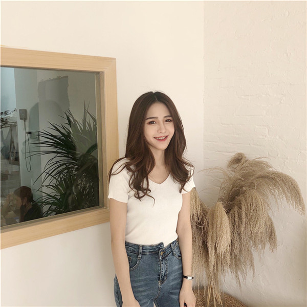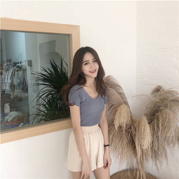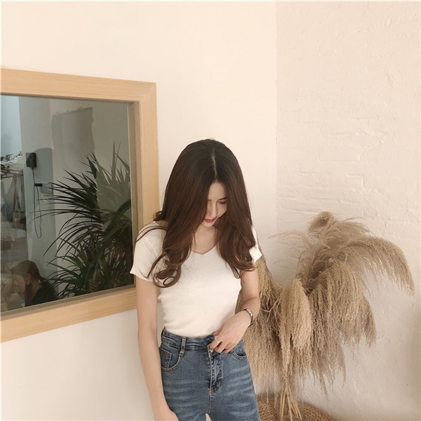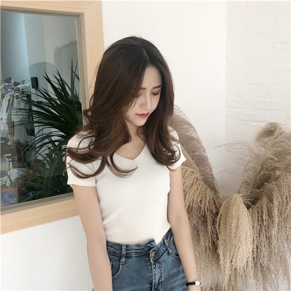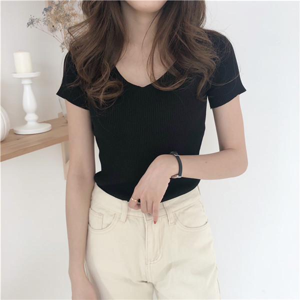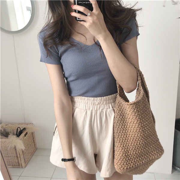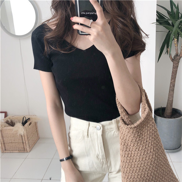 激安 サマーニット トップス フレンチスリーブ ストレッチ Vネック ゆったり スリム リブニット ニットソー カットソー レディース 春夏 無地