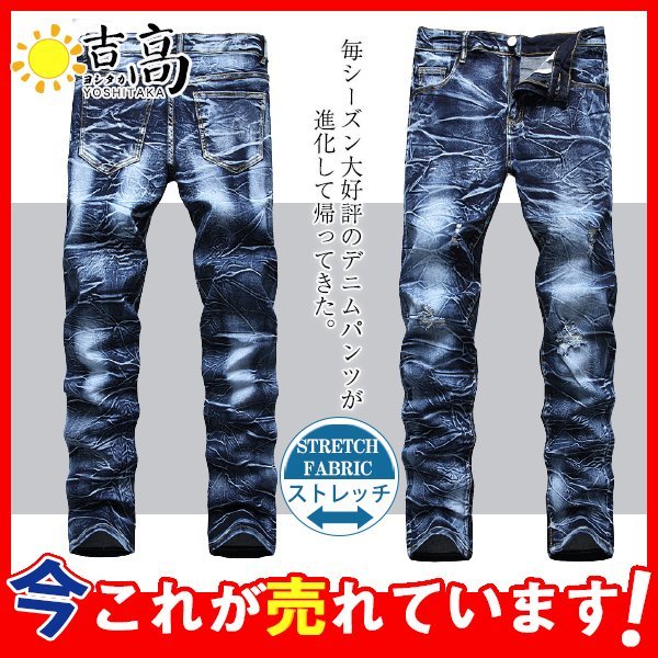 デニムパンツ メンズ スキニーデニム 細身 ダメージ ユーズド加工 スリム タイト ジーンズ ジーパン ストレッチ 伸縮 ワンウォッシュ ボトムス