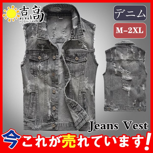 デニムベスト メンズ デニム ジージャン Gジャン 立ち襟 ダメージ加工 チョッキ ノースリーブ カジュアル アウター バイク デニムジャケット