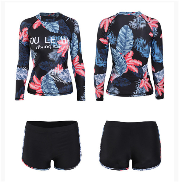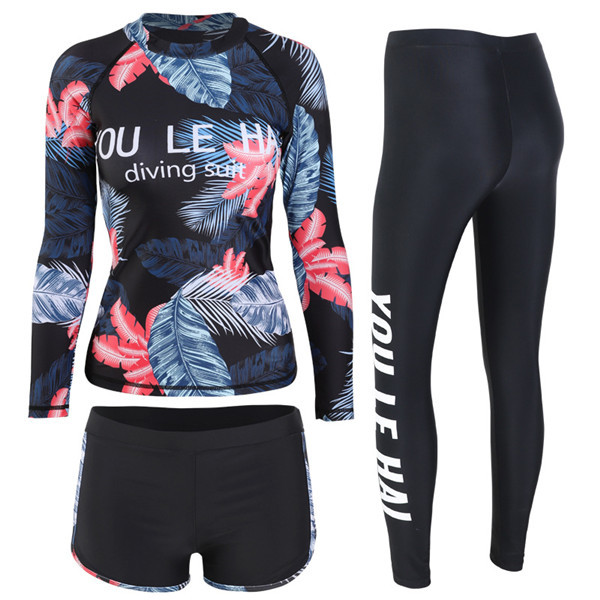 フィットネス水着 レディース 3点セット 総柄 レギンス 長袖 ラッシュパーカー 体型カバー 競泳水着 練習用 海外旅行 めくれ防止 着脱しやすい