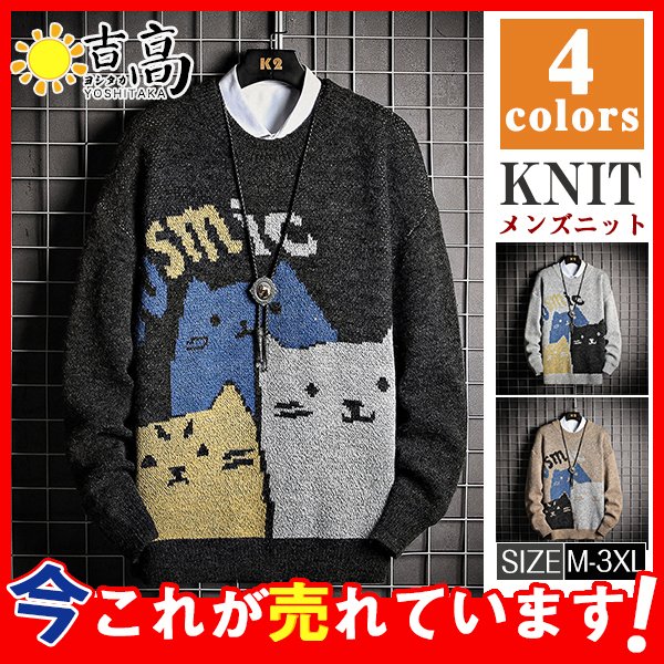 ニットセーター メンズ 猫柄 ねこ クルーネック カジュアル 大きいサイズ ゆったり インディゴ 厚手 防寒 冬服 秋冬 体型カバー 通学 かっこいい