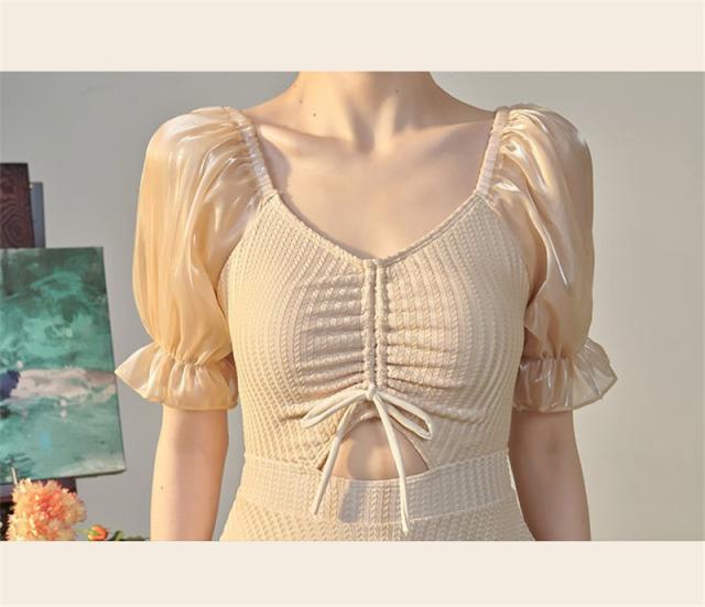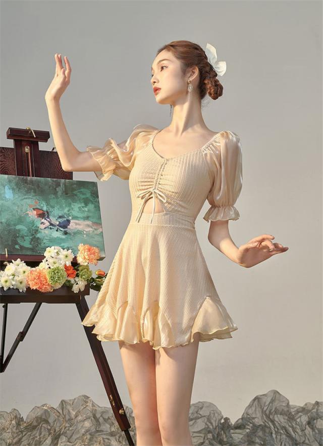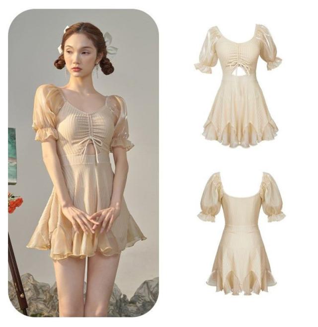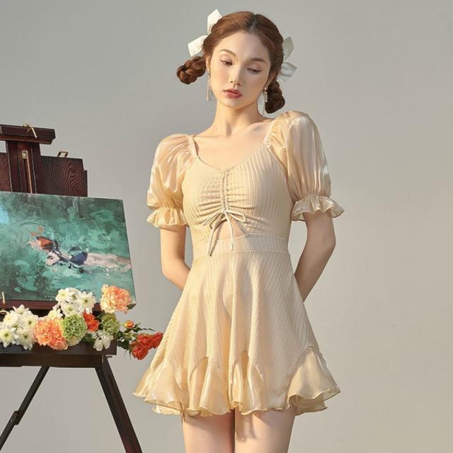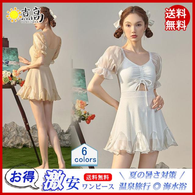水着 レディース ワンピース フリル チュニック キャミソール風 リボン ハイウエスト ドレス ワイヤー付き 着痩せ 無地 可愛い ビーチ 学生 お姫